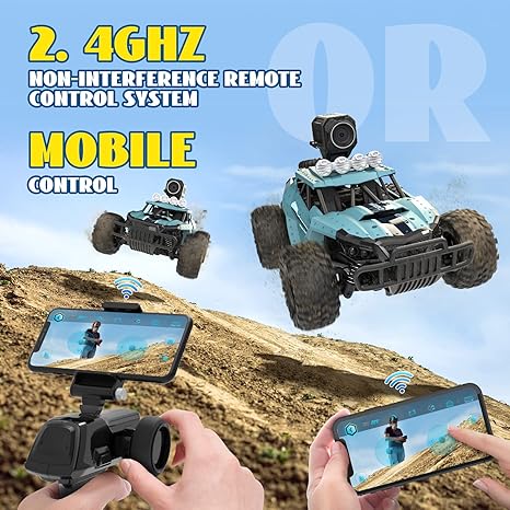 ▽Dual Control Mode▼You can drive this truck with two modes K2.4Ghz radio remote control( radio control range up to 165ft), it allows you racing them with your friends at the same time.L Mobile phone App driving (Wi-Fi control distance up to 100ft ), You don't need to follow the car around and can share what you capture with your friends or the world via social media.▽60 Mins Running In Total▼With the upgraded of TWO li-ion battteries, the play time of each battery reaches up to 25-30 MINS on the full charge condition with the 7.4V 1000mAh li-ion rechargeable battery. Speed is up to 15-20 KM/H with the two powerful motors. Enjoy in the exciting racing driving!