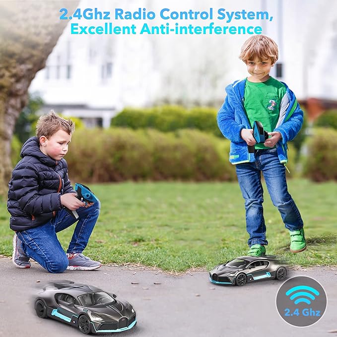Proportional Steering System: There is a white wheel alignment adjuster at the bottom of the remote toy cars. Through manual adjustment, you can align the wheels correctly, so that you can better control the direction of the remote control car when racing with friends; in addition, the car can be adjusted within 200 feet from the controller.A Must for Every Car Fan: Everyone would love to drive a super-fast, expensive car and make every jaw drop when passing by. Our remote control car is a genuine Bugatti Divo replica, designed to offer you a very close to reality experience and make you feel like a professional race car driver.